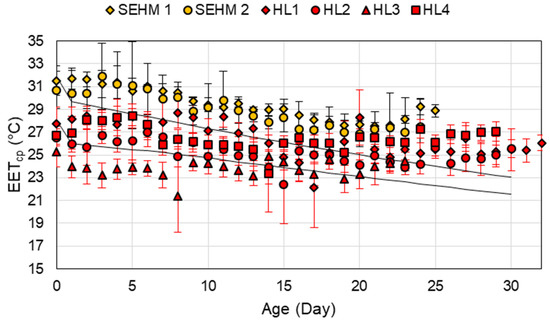 The increasing trend of the EETcp starting at around 21 days of age (Figure 9) suggests that the piglets are more effective at thermoregulation and require a lower EETcp. Recent studies have predicted the supplemental heat needs for piglets based on Tdb and BW resulting in conditions late in lactation needing no supplemental heat [10]. These results align with the increase in EETcp and the average weight at 21 days of age to support the lack of supplemental heat need for the piglets.