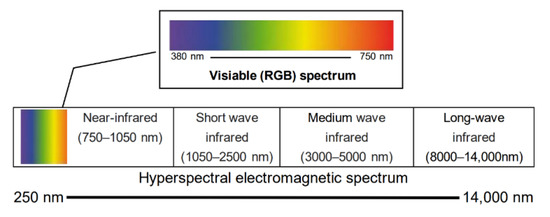 Depiction of the different wavelength ranges of visible color imaging and hyperspectral imaging. The wavelength range of visible light is from approximately 380 to 750 nm, a small portion of the range of HSI.