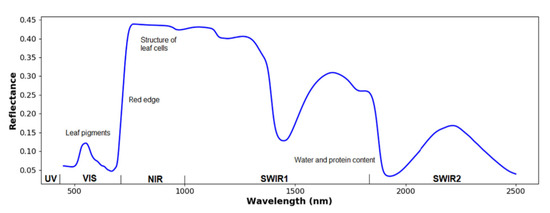 Illustration of a typical reflectance spectrum of a green leaf. UV, VIS, NIR, and SWIR refers to ultraviolet, visible spectrum, near-infrared, and short-wave infrared, respectively [41]. Near-infrared light is affected by the structure of leaf cells, while the SWIR light is dominated by water and protein content.