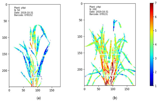 The HSI nitrogen (N) distribution maps of wheat cultivar Yitpi under different N treatments. Different levels of N% are presented using different colors, with red referring to the highest N% while blue refers to the lowest N% [78]. In image (a), the plant treated with 50 mg/kg N has more blue pixels than the plant treated with 200 mg/kg N, which is shown in image (b). This means that the leaves of the plant in image (a) contain lower N content than the leaves in the plant of image (b). The imaging date was 31 October 2019.