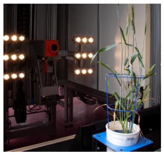 The literature shows that HSI combined with machine learning technologies can be successfully applied to sense photosynthetic activity, water, and nutrient content. Thus, we made a hypothesis that HSI can be applied to detect crown rot infected wheat plants at an early stage without visible symptoms on leaves by sensing photosynthesis or water and nutrient contents in plants, and conducted a preliminary experiment to support the hypothesis. The experiment was conducted in The Plant Accelerator located in the Waite campus of The University of Adelaide. Four widely grown wheat varieties (Aurora, Yipti, Trojan, and Emu Rock), which have different levels of susceptibility to crown rot disease [100], were chosen for study. The plants were grown in soil substrate under 2 disease treatments of “controlled” and “infected” with 26 replicates for 4 varieties, resulting in a total of 208 pots of wheat plants for the study. To infect the plants, we placed 10 F. pseudograminearum incubated seeds around the base of the seedling’s shoot 14 days after sowing, defined as the first day after infection (1 DAI). On the same day, all seedlings were transported to the lanes of the LemnaTec plant phenotyping platform (LemnaTec GmbH, Aachen Germany) for hyperspectral imaging. Once on the phenotyping platform, the plants were automatically watered daily to a set target weight. Two cameras were located in the hyperspectral imaging chamber (WIWAM, Ghent, Netherlands) of the phenotyping platform for whole-plant imaging, as shown in Figure 4. The FX10 camera (Specim, Oulu, Finland) captured the visible and near infrared (VNIR) data from 400 nm to 1000 nm with 5.5 nm full wavelength at half maximum (FWHM), while the short-wavelength infrared (SWIR) camera (Specim, Oulu, Finland) operated in the range of 1000 nm to 2600 nm with 12 nm FWHM. Hyperspectral imaging was conducted weekly starting on 15 July (11 DAI), when the shoots were large enough for side-view imaging, to 2 September 2021 (60 DAI), when the plants were in the early milk stage.