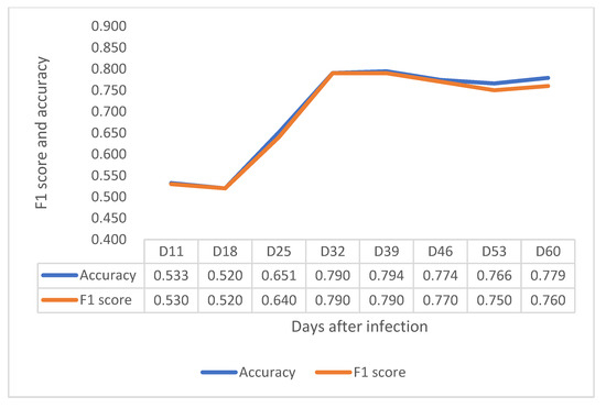 In the VNIR region, F1 score and accuracy have a clear increasing trend until 32 DAI, at 0.790 in F1 score and 0.790 in accuracy (Figure 5). In the contrast, F1 score and accuracy in SWIR increased considerably from 11 to 39 DAI and became stable from 39 DAI to 53 DAI, as shown in Figure 6. Notably, although the F1 score and accuracy values at 32 DAI are 0.756 for accuracy and 0.750 for F1 scores, the peak values of both factors at 60 DAI are around 0.83. The results showed that both VNIR and SWIR have F1 classification scores over 0.75 after 32 DAI, which provides support for the early detection of crown rot in the future by both sensors.