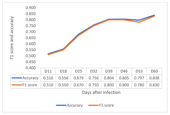 Depiction of F1 score and accuracy of the VNIR sensor from 11 to 60 DAI.
