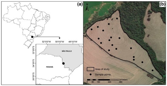 The study was conducted in a 40.1 ha field located in Itararé, São Paulo state, southern Brazil (24°01′36.93″ S–49°25′33.46″ W, 640 m of altitude) (Figure 1). The local climate is defined as a subtropical humid (Cfa) climate according to the Köppen classification [27]. Most rainfall occurs between October and March, with a relatively dry period between April and August. The annual average rainfall is 1532 mm, with mean temperature of 17 °C [28]. The main soil type in the region is a Dystrophic Red-Yellow Oxisol [29], with a sandy clay loam texture. The terrain slope average is 6.28 degrees, which necessitates its cultivation in contours and the use of terraces.