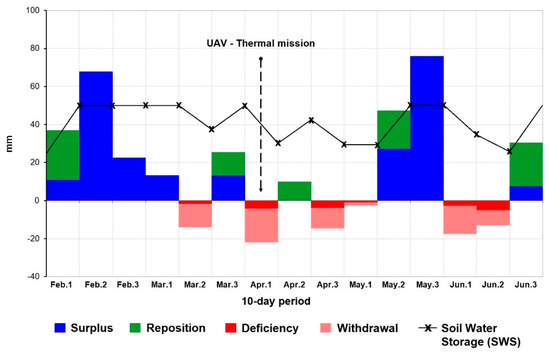 Climatological water balance [30] calculated in a ten-day time step and considering 50 mm of soil water holding capacity. The dashed line indicates the UAV mission conducted on 2 April 2019.