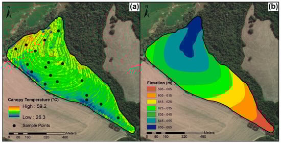 Canopy temperature orthomosaic obtained with aerial thermal imaging (a) and hypsometric map of the experimental field (b).