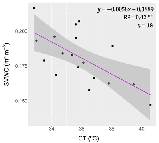 Linear regression model between canopy temperature (CT) and soil volumetric water content (SVWC). R2 = coefficient of determination; n = number of samples; correlation was significant at 0.01 probability level (**).