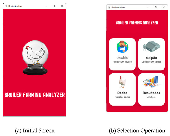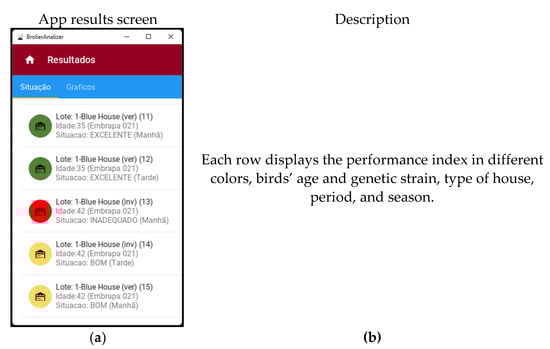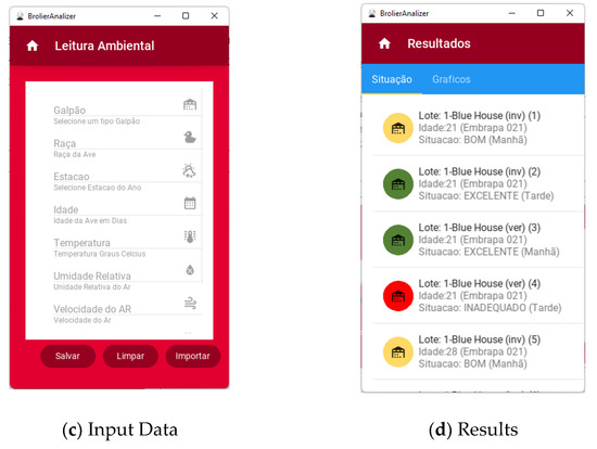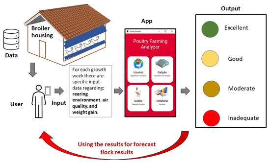 Figure 2 shows how the App operates using the housing environment and flock data, interactions with the user, a visualization of the App screen, and the possible outputs. The App was initially developed for Brazilian users; therefore, the input and output results are written in Portuguese.