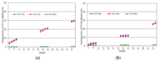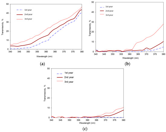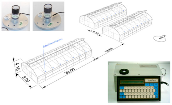 - In-situ measurements were conducted using UV-B (290–315 nm, W m−2, model SKU 430, Skye Instruments Ltd, U.K.) and UV-A sensors (315–380 nm, W m−2, model SKU 420, Skye Instruments Ltd, U.K.) installed inside and outside each greenhouse (Figure 1). Values were collected on a data logger system (model DL3000, Delta-T Devices, Cambridge, U.K.) every 30 s, and 10-min average values were recorded.