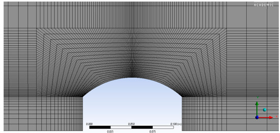 The blackened area in Figure 4 represents the area of the model in which the density of the mesh was greatly increased. Great importance was given to the area near the obstacle, because it would reveal several phenomena in the flow which were the objects of the present study. For this reason, the area near the greenhouse-like obstacle received the highest density. Accordingly, the mesh around the obstacle area was constructed as shown in Figure 5, and it was done this way to achieve as much speed and pressure data as possible from the areas where intense turbulent phenomena are usually expected (swirls, abrupt changes in the direction of fluid movement due to geometry, etc.). Validation of the models used has been conducted by other researchers using the same experimental air flow conditions as us around modified arched, even rectangular or multi span greenhouses in wind tunnels [8,9], and therefore, it was not the subject of the present work.