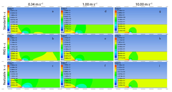 Pressure distributions for the wind tunnel flow velocities of 0.34, 1.00 and 10.00 m s−1 from Standard k–ε (a,d,g), RNG k–ε (b,e,h) and Realizable k–ε (c,f,i) models.