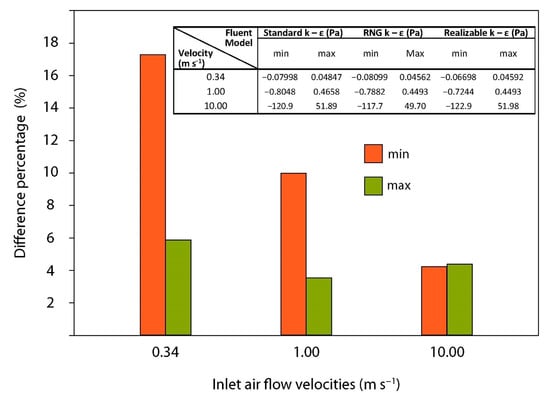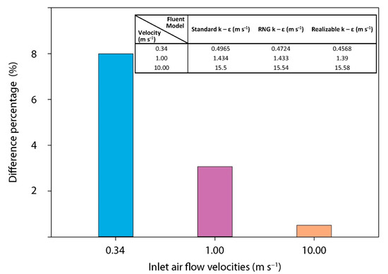 The maximum values of the velocities along the airflow in the wind tunnel and the speed differences (%) between the models for the different air speed velocities are presented in Figure 10. When the flow velocity increases, so does the convergence of the results of the three k–ε models, in terms of pressure and velocity within the wind tunnel, as can be seen in Figure 9. The percentage of surface area at which high speeds are predicted also signifies the qualitative differences in the speed distributions. When the velocity was 0.34 m s−1, the Realizable model predicted that the speed will be up to 20% higher at almost 75% of the wind tunnel. As expected, all models predicted that the maximum speed would be on the roof of the model (Figure 8 and Figure 9).
