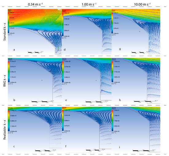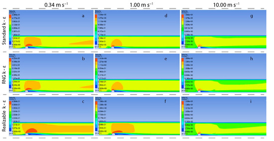 However, it should be noted that the area in which the upper speed limit appears decreases for all three models (Standard, RNG, Realizable) as the flow velocity increases. In fact, when the flow velocity was set to 10 m s−1, the area where the upper speed limit appears could be found only above the obstacle (Figure 9).