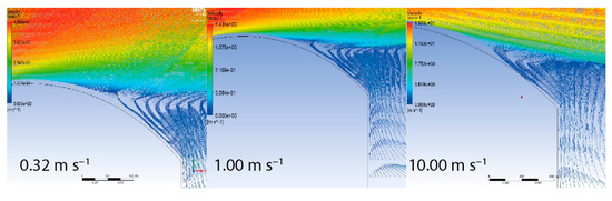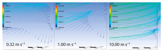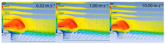 The existence of clockwise vortices for the airflow entry velocities of 0.34 and 1.00 m s−1 into the wind tunnel is shown in Figure 14. Obvious vortices in the case of 10 m s−1 are missing (Figure 14). In this case, it could be explained that as the flow velocity of the model increased, the vortex was pressed against the wall, thereby decreasing in size.