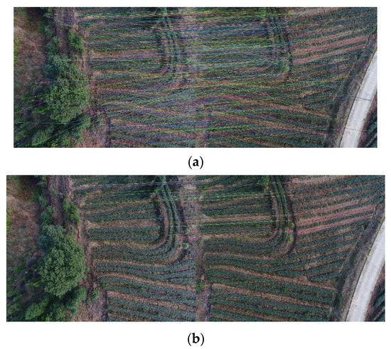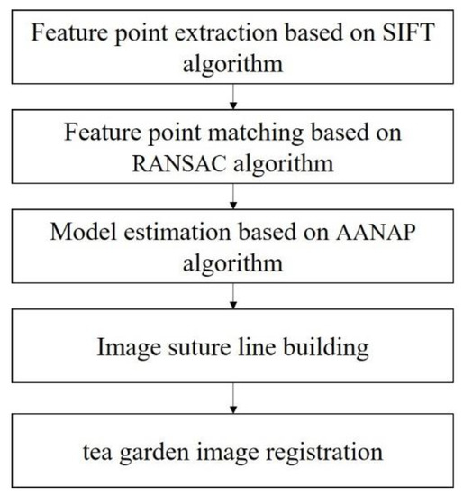 Image mosaic technology has been widely studied in many fields to stitch the images together. It includes image registration and image fusion. The image registration results affect the image fusion. With the diversity of the actual scenes, it is difficult to design a registration algorithm suitable for all scenes. To date, image registration includes frequency-based image registration and space-based image registration. Frequency-based image registration uses the Fourier transform to transform the image to the frequency domain for related processing. The typical frequency-based image registration is the Fourier–Mellin transform [7], phase correlation method [8] and the extended phase correlation method [9]. According to the research, it is known that frequency-based image registration methods can overcome the brightness difference and anti-noise and it is fast and efficient. However, it requires a large overlap ratio between two images, which is mainly applied to the horizontal transformation [10,11]. Therefore, the use of this method in a tea garden is greatly limited. The space-based image registration method is based on gray level or images features. The former divides the overlapping areas of one image into multiple sub areas and calculates their similarity of pixel values using a certain similarity criterion to obtain the translation. The principle of this algorithm is simple. Meanwhile, the registration effect of rigid transformation is good. However, it is greatly affected by illumination and noise, resulting in a large number of calculations [12]. To date, image registration based on features is the most widely used [12,13]. The features generally include feature points, straight lines, edges, and contours. This kind of registration algorithm extracts and matches the corresponding feature points of two images. Then, it calculates the transformation model between the two images to complete the registration.