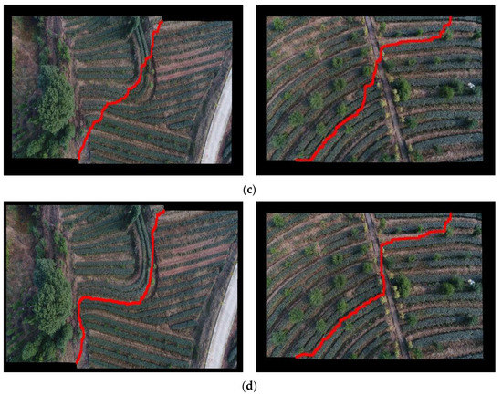As shown in the above figures, the bold, red, solid lines are used to display the sutures searched. The image suture line refers to the line of pixels that are most similar to each other in the overlapping area of mosaic images. The two sides of the line are taken from the content of two images, respectively. The suture strategy greatly reduces the overlap area, which in turn alleviates the problems of blurring and ghosting. The higher the quality of the obtained suture, the more natural the transition of the two images on both sides of the line. Most sutures searched based on the color, texture, or traditional energy function [34,35] combine color and texture and cross the walking spaces of the tea tree area. They increased the probability of misplaced truncation. The algorithm used in this study first searches along the road between the tea trees, reducing the number of tea trees passing through, ensuring the continuity and integrity of the tea trees as much as possible, which conforms to human visual perception and facilitates subsequent agricultural analysis.