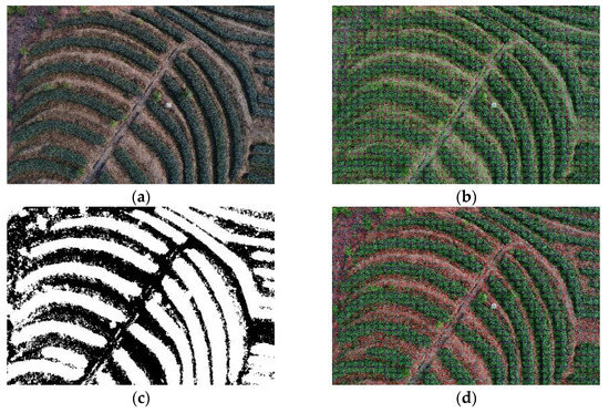 In Figure 11b, the road and the walking spaces between the tea trees are inhibited, while the green features of the tea garden, including the green trees, pools, and other green crops, are retained. Most non-green features, such as the roads, can be directly eliminated by the RGRI index calculation with a set threshold. Then, an open operation was used to eliminate the legacy of the path points, and expanding operations were used to fill the hole of tea tree (r = 5). Finally, we obtained the binary mask image (Figure 12c). If the extracted point is in the image, it is retained; otherwise, is deleted. By using this method, we can reduce the calculation. The steps are shown in Figure 12.