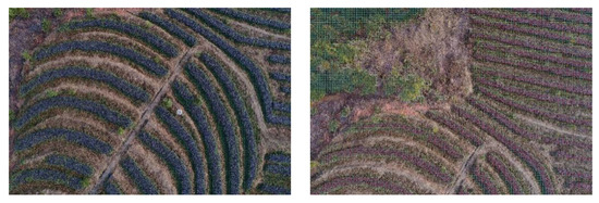UAV has been widely used in agricultural irrigation, farmland vegetation data monitoring, soil temperature monitoring, agricultural disaster monitoring or evaluation, and site exploration due to its advantages of high time-efficiency, low loss, high resolution, and low cost [1,2]. UAVs can carry different kinds of cameras to obtain aerial images at different altitudes according to the different requirements. They can also carry out relevant processing on the captured images [3,4] to obtain required parameters and information [5,6]. However, limited by altitude and camera resolution, it is difficult to obtain a wide range of high-definition images, especially in agriculture or forestry. A single image only contains local information if the target area and crop distribution are large, such as a tea garden.