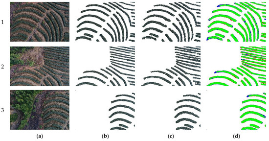 Comparison images of the ground truth and method in this study. (a) Raw image; (b) tea tree extracted by humans; (c) tea tree extracted in this study; and (d) result of the contrast between (b,c).