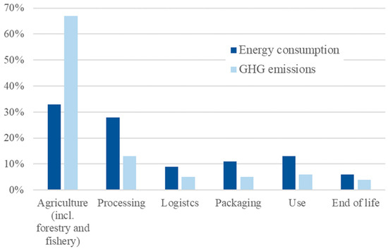 Per capita energy consumption (average 23.6 GJ) and GHG emissions (2965 kg of CO2) in the food system in the EU in 2013, broken down into food production stages. Adapted from [13].