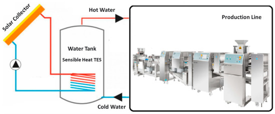 In agroindustry, SHS using water tanks heated with renewable energy surplus represents the state of the art and technological maturity of TES solutions, and suffers from all the inefficiencies previously mentioned, namely, requiring relatively high storage volumes in centralized schemes that do not allow the addressing of temperature stabilization in the storage medium, often with relevant losses due to heat radiation. In addition to this, there is also the stiffness of the solution, the inability to address the dynamics and flexibility of the production lines, and the inability to recover smaller heat losses, which are wasted along the production chain. A scheme based on centralized SHS integrating renewables (solar thermal) is represented in Figure 2.