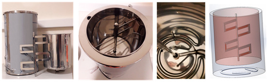 Tempering and mixing equipment for granulated materials (e.g., milk, chocolate, or butter). From left to right: outer tank, rotating arm, and inner tanks; top view of the equipment; heating resistor; computer view of the equipment.