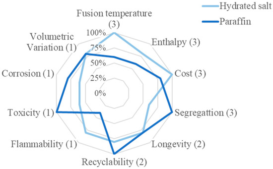 Application of the PCM selection methodology to two materials, a hydrated salt and a paraffin. The importance criteria are shown in brackets, for each of the selection parameters. The hydrated salt is better in three of these when compared to the paraffin. Scores are shown in percentage, given by the importance times adequacy. Thus, 100% will correspond to 15, 10, and 5 points, for the importance of 3, 2, and 1, respectively. The hydrated salt scored 81 and the paraffin 78.