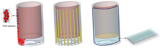 Three encapsulation options were initially considered for the selected S34 PCM, namely, spheres, rods, and tablets; see Figure 6. Each one was influenced by different variables of thermophysical and operational nature, and the encapsulation selection process aimed to establish decision criteria that would be replicable in other agroindustrial operations and equipment scenarios. In all solutions, to minimize changes in equipment and operational and maintenance processes, it was decided to maintain some of the water in the jacket, to act as an accelerator and homogenizer in the heat transfer process between the heat source, the PCM, and the inner tank.