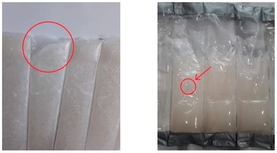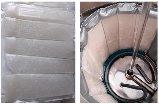 One major practical drawback in the experimental tests was the degradation of the PCM encapsulation. As mentioned, the PCM was encapsulated in sectioned tablets built on flexible LDPE. This option proved to be adequate for the easy upgrade of equipment, which is an important vector for the dissemination of results. However, the option for a plastic enclosure, which is a cheap and flexible material, showed technical limitations. In addition to the degradation of the compartmentalization seals (see Figure 21, left), with the change in phase there was a deformation of the PCM bags, which molded to the walls of the inner tank. This process complicated the PCM removal, for instance, for maintenance purposes, tearing most of the wrappers, limiting their reuse (see Figure 21, right). With a view to maintaining the geometry, it will be important in future work to consider different encapsulation materials, such as aluminum foil.