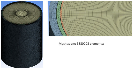 In the first simulations, a 3D model with a mesh of more than three million elements was developed; see Figure 8. Simulations converged slowly, with more than three days of processing for each step of five seconds with an Intel Xeon W-2155 Processor (3.30 GHz). To overcome this restriction, considering the symmetry of the equipment, a 2D cross-section model was developed; see Figure 9. With this solution, it was possible to improve the simulation speeds to approximately five minutes for steps of five seconds.