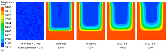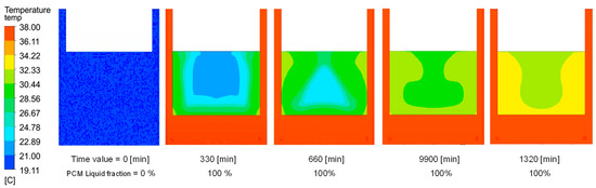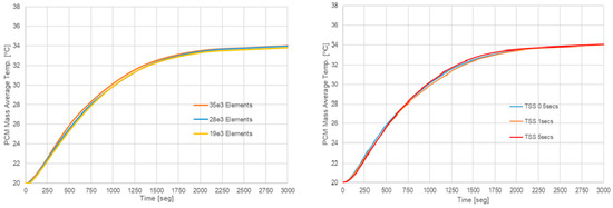 The grid and time-step independence study are reflected in Figure 10. Three grids were tested with 35 × 103, 28 × 103, and 19 × 103 elements, using the PCM average mass temperature as a control variable. With a slight difference that excluded the 19 × 103 elements grid, the two others almost overlapped (over 98% convergence). The 28 × 103 elements were selected for all the numeric work, as the other would only increase the processing time with negligible improvement on the results.