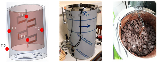 - Case 3–Charge: water jacket filled with 3.5 L of S34 and 8 L of water, constant heating source (38 °C), inner tank partially filled (60%) with the chocolate mix starting at ambient temperature (20 °C).