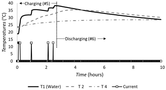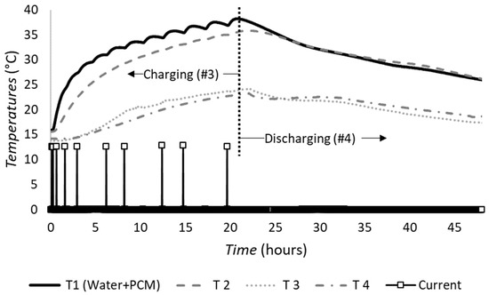 - An increase in the charge and discharge periods was observed due to the PCM incorporation, which was due to the rise in the stored thermal energy. Comparing the discharges in #2 (Figure 17) and #4 (Figure 18), the PCM introduction allowed the increase in the discharge period (38 to 30 °C) of 272% (in line with CDF simulation increase), extending the operation period above 30 °C in 8.6 h, from 5.0 h to a total of 13.6 h.
