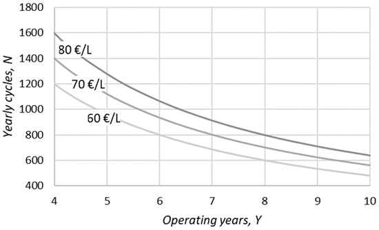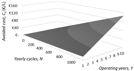 Dependence of the total avoided cost with the integration of PCM, , with the number of early cycles of charge and discharge, , and the operating years, . For the current example, values below 80 €/L are viable.