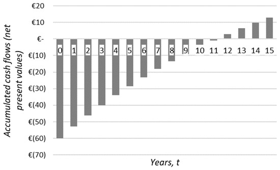 For the example of €/L, considering , years, €/kWh, and prospective cycles per year, €/L, which means a viable project. The net present accumulated cash flows are shown in Figure 24, where the payback period, considering net present values, is 12 years (the simple payback period, with simple, financial cash flows considered, was obtained at the end of the 8th year). , more than 50% above , was also obtained, which demonstrates the quality of the investment, under the previous assumptions.