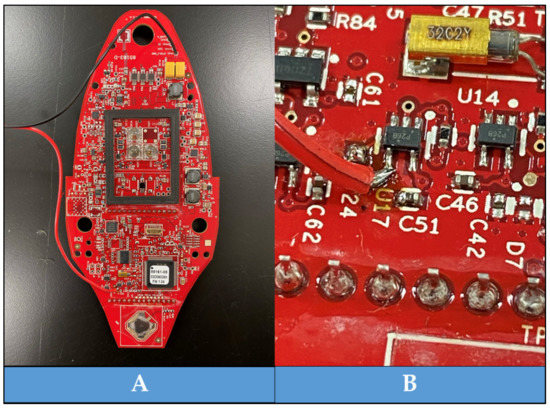 A modified GreenSeeker’s internal circuitry from two perspectives. (A) GreenSeeker PCB with leads soldered to the TTL signal lines and ground terminal, (B) The Greenseeker’s TTL TX signal lead soldered on the PCB.