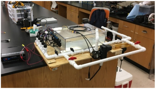 The second piece of equipment that needed to be integrated with an Arduino for the system was the Raven flow meter (RFM-5, Raven Industries, Sioux Falls, SD, USA). This flow meter was used to monitor the flow of N coming from a supply tank for the fertigation system. A scaled simulator was developed in a laboratory setting to investigate the output signals from the flow meter (Figure 2). The Raven flow meter communicated flow rate through a variable frequency output signal which was recorded by an Arduino Mega microcontroller and converted into a corresponding flow rate value using Equation (6) which was derived from the flow meter’s documentation: