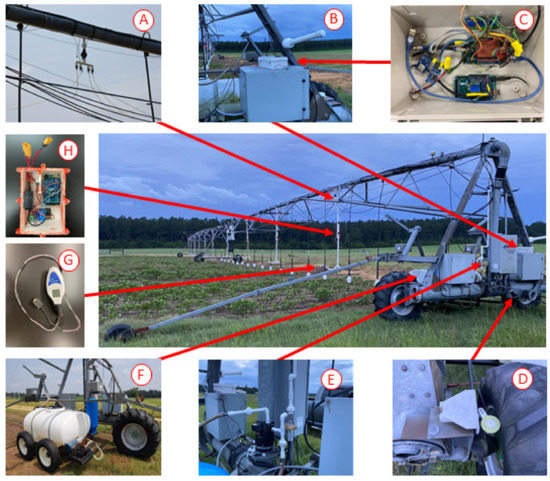 The systems’ major components: (A) the N injection point, (B) the mainline controller, (C) the mainline controller interior, (D) the rotary encoder mounted against the lateral’s wheel, (E) the flow control bypass system, (F) the N supply tank, (G) the modified handheld GreenSeeker, and (H) the field node.