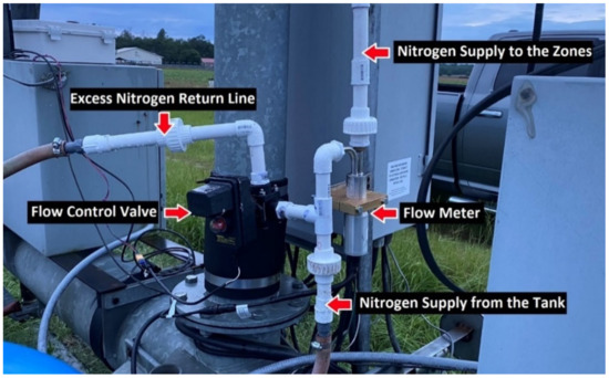 The N mainline supplied N to ten application zones across the length of the lateral using a 19.05 mm (3/4 in) CPVC mainline pipe. A pressure gauge was fitted to the mainline pipe after the bypass system to monitor the mainline pressure. In each zone, N was pumped through a 19.05 mm (3/4 in) check valve (18341, United States Plastic Corp., Lima, OH, USA) to prevent water from entering the application system if the pressure dropped below the irrigation system pressure. N application rates to each zone were controlled by pulsing 2-way, 24 VAC electric solenoid valves (USS-LSV00005, Joyfay International LLC, Cleveland, OH, USA). Each solenoid valve supplied N to four hoses fitted to the irrigation drop lines using a t-fitting (Figure 3A). A CP4916-15 orifice disk (TeeJet Technologies, Springfield, IL, USA) was placed at each t-fitting to regulate flow and pressure.