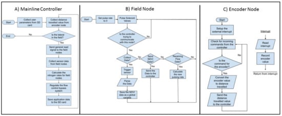 The program flow charts for the software written to wirelessly control the applicator system (A) the program flowchart for the mainline controller, (B) the program flow chart for the field nodes, and (C) the program flowchart for the encoder node.