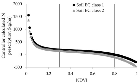 Controller–calculated N prescriptions (kg/ha) vs. controller-recorded NDVI values. The vertical lines represent the typical range of NDVI values observed in cotton. The average application rate for the full range of NDVI values was 179.75 kg/ha for the soil EC classification 1 and 106.49 for the soil EC classification 2.