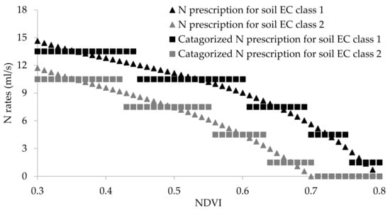 Controller–calculated N rates for soil EC classification 1 (black triangles) and soil EC classification 2 (grey triangles) and the controller-categorized N rates for soil EC classification 1 (black squares) and soil EC classification 2 (grey squares) vs. controller-recorded NDVI values. The average application rates for each rate classification of 0, 1.5, 4.5, 7.5, 10.5, and 13.5 mL/s were −10.107, 1.328, 4.433, 7.472, 10.622, and 29.329 mL/s for the soil EC classification 1. The average application rates for each rate classification of 0, 1.5, 4.5, 7.5, 10.5, and 13.5 mL/s were −14.024, 1.529, 4.644, 7.625, 11.477, and 33.279 mL/s for the soil EC classification 2.