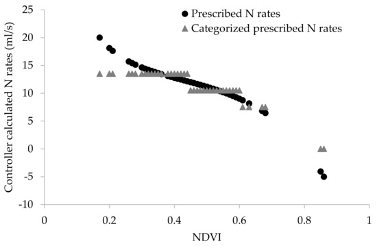 Controller–prescribed N rates (mL/s) and the controller-categorized N rates (mL/s) vs. controller-recorded NDVI values.