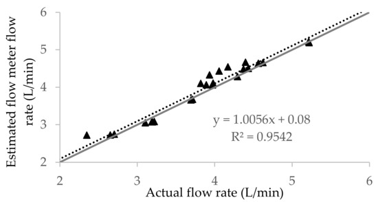 Controller-estimated flow rate using the flow meter vs. the actual flow rates measured by hand. The black triangles represent the recorded flow meter values while the grey line represents a 1:1 line.