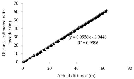 Controller–estimated distance travelled using the rotary encoder vs. actual distance travelled. The black triangles represent the encoder values, while the grey line represents a 1:1 line.