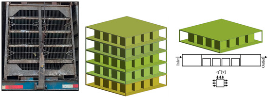 The poultry coops are loaded with broilers on the farm, stacked on a trailer, transported to the processing plant and are parked in holding sheds as shown in Figure 1. These holding sheds are equipped with fans to blow air to improve the immediate bird environment inside the coop. Temperature and relative humidity are the two significant environmental parameters that determine the broilers welfare inside the coop. The combined effects of both temperature and relative humidity are often used to evaluate the bird welfare via an integrated comfort index called Enthalpy Comfort Index [23,24]. In this context, Enthalpy Comfort Index (ECI) is defined as: