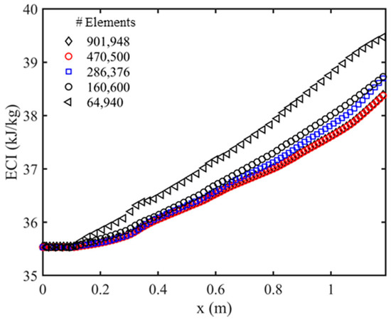 The mesh independency analysis by calculating ECI along x-axis for an ambient temperature of 300 k, relative humidity of 15%, the broilers heat production of 150 and air velocity of 0.5 m/s.
