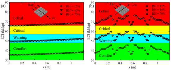 Effects of inlet air relative humidity on the enthalpy comfort index for inlet velocity of 0.5 m/s, inlet temperature of 300 k, and the broilers heat production of 150 along (a) x-direction and (b) z-direction.