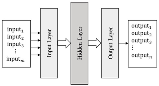 ANNs are statistical models used to find non-linear relations between input data () and outputs (). In other words, ANN is a process of estimating the function that maps inputs to the outputs, i.e., . In general, the input and outputs can be vectors of lengths m, and n (m, n), i.e., , and as shown in Figure 5.