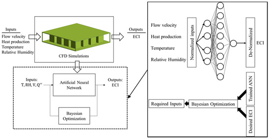 Equation (1), despite being a powerful tool to estimate the welfare of the broilers using two most important parameters (i.e., ambient temperature and relative humidity), is not capable of distinguishing between the bird welfare along the length of the coop (fan side, center, or far from the fan). Typically, due to the heat production by the birds, birds located at the center and downstream of the coop experience more thermal discomfort compared to those near the fan (inlet). In the absence of experimental data, we applied computational fluid dynamics (CFD) simulations to model the immediate bird environment inside the coop via calculating a microenvironment metric (ECI) and using this metric in the machine learning model (Artificial Neural Networks and Bayesian Optimization). The CFD model [13], ANN model, and Bayesian optimization are presented below.